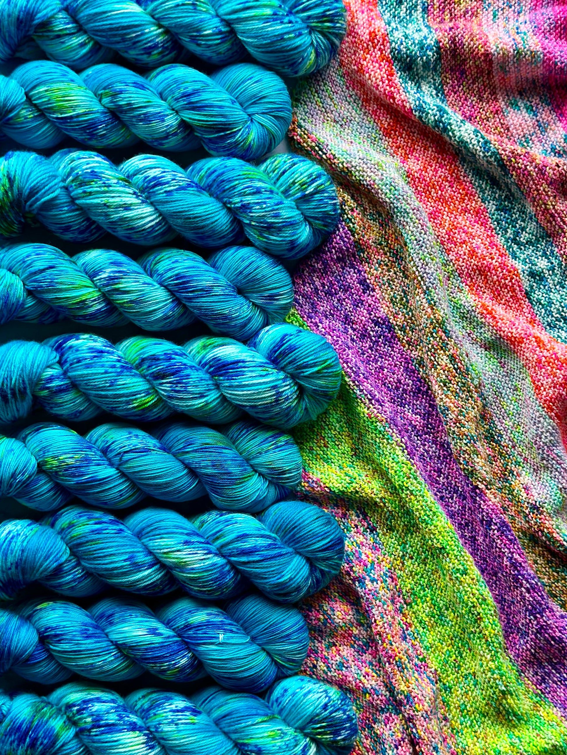 This yarn is hand painted in the Cotswolds using professional dyes and methods. Although the yarn is dyed in small batches, to help encourage similar colourways, no two skeins will be the same, meaning each skein will be a one of a kind creation. Therefore, I would recommend when using the same colourway throughout a larger project, to alternate between the skeins to help blend the yarns together and help prevent pooling.