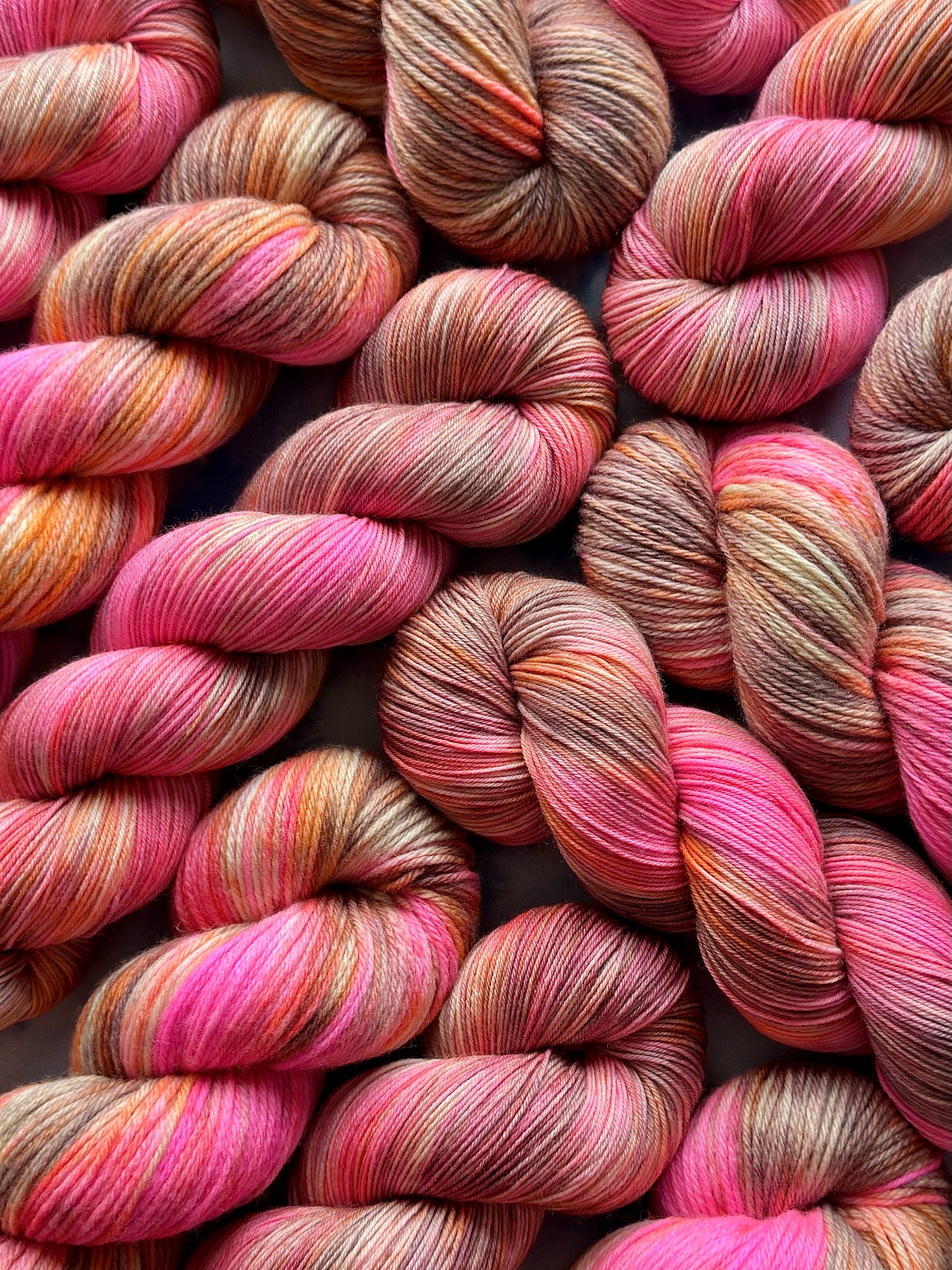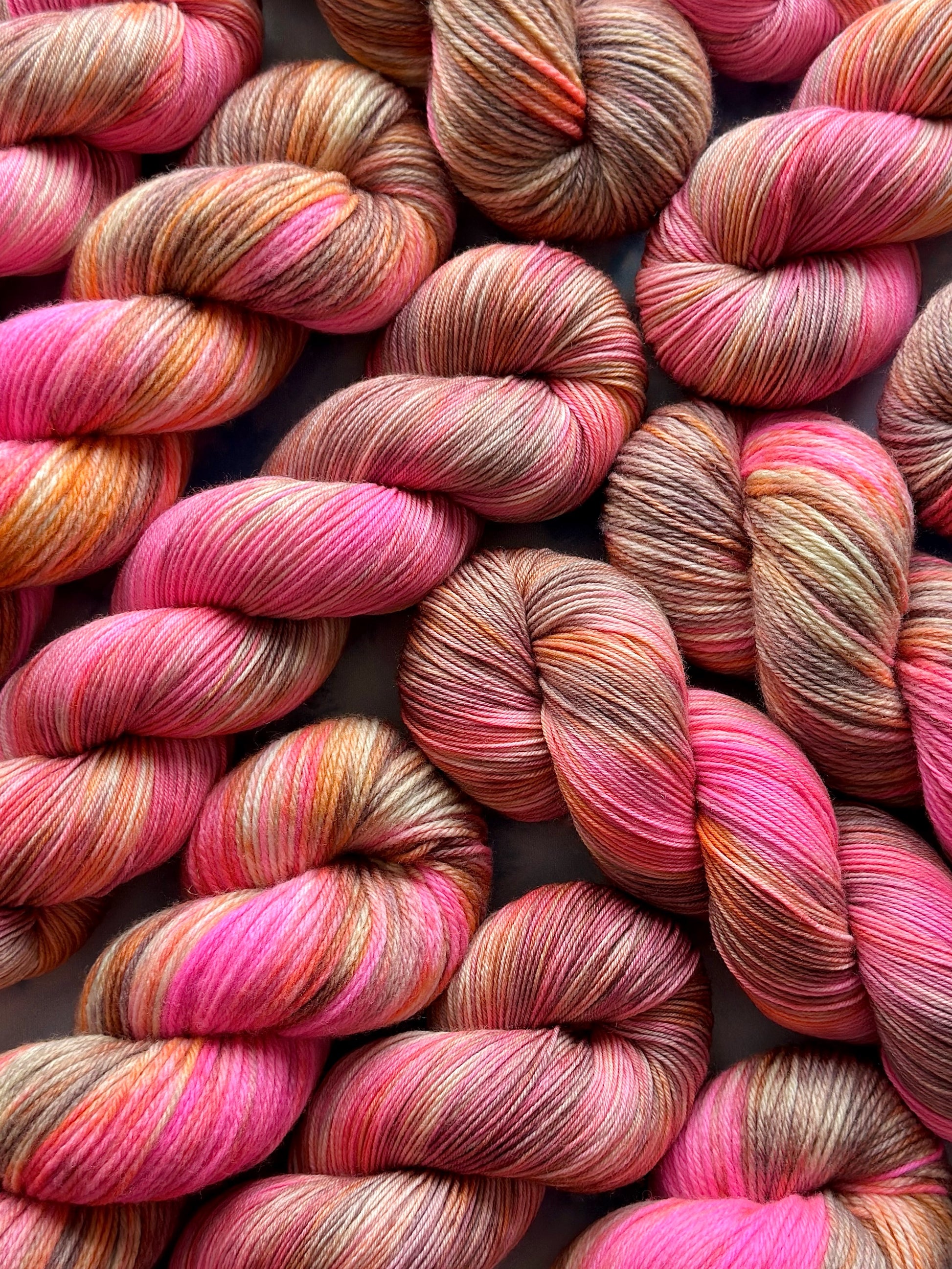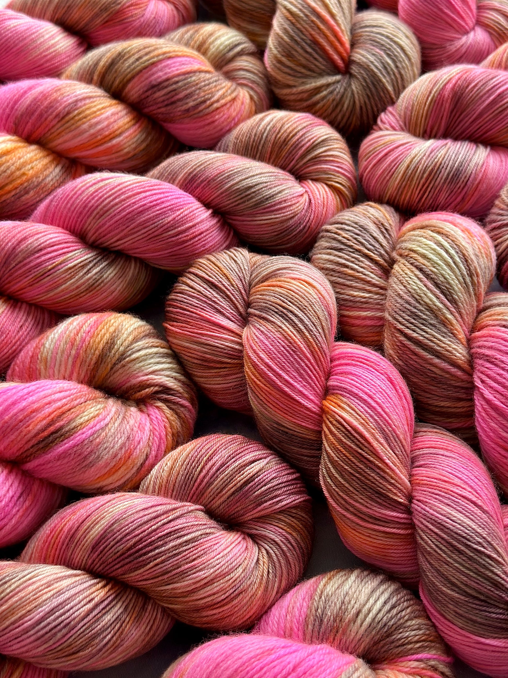 This yarn is hand painted in the Cotswolds using professional dyes and methods. Although the yarn is dyed in small batches, to help encourage similar colourways, no two skeins will be the same, meaning each skein will be a one of a kind creation. Therefore, I would recommend when using the same colourway throughout a larger project, to alternate between the skeins to help blend the yarns together and help prevent pooling.
